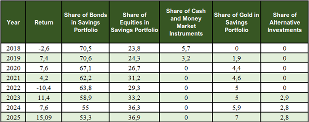 Another significant development was the inclusion of gold in the structure of the savings portfolio. In 2018, this asset was absent, whereas by 2025 its share had reached 7.0%. From a risk management perspective, this is particularly important, as gold is traditionally regarded as a safe-haven asset during periods of heightened uncertainty, inflationary pressure, and financial instability.
